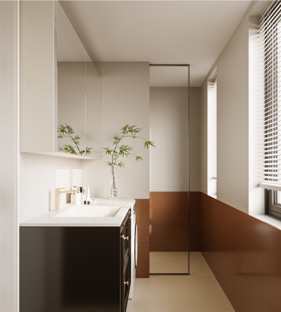 The walls are clad in beige and brown tiles split horizontally for visual depth. A mirrored cabinet is cleverly organized with open niches and closed drawers, combining display and storage. The silk-inspired lighting concept continues here, subtly enhancing the refined and cohesive aesthetic throughout the home.