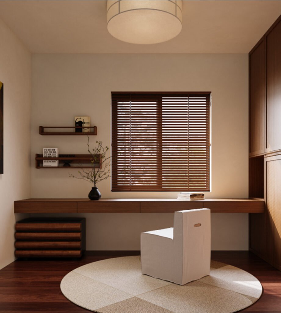 A backdrop of beige paint sets a soft, warm tone that promotes comfort and focus. Combined with reddish-brown flooring, the color scheme feels natural and layered. Decorative cabinet doors break the monotony of the walls, adding artistic flair. A beige-white linen desk chair complements the main palette, while wooden blinds allow adjustable lighting. A beige round rug helps define the space and adds coziness. A functional nightstand keeps the area tidy and organized.