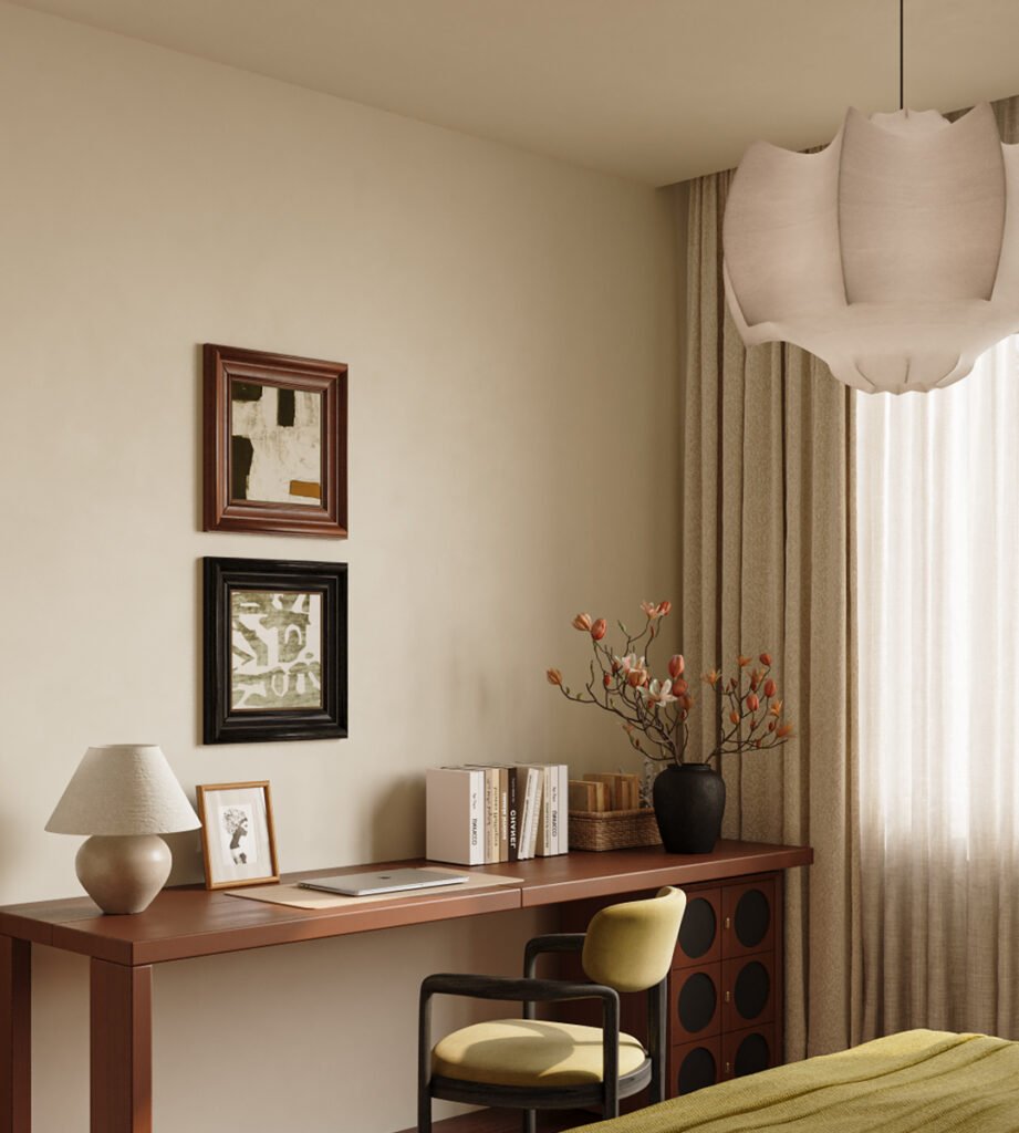 Wooden cabinet doors with grid lines enhance texture and layering, harmonizing with the floor tones for a unified look. A beige-gray square bed dressed in yellow-green and white bedding brings a fresh, cozy feel. Matching wooden nightstands echo the main finishes while providing storage. A black tea table creates striking contrast against the lighter palette. A connected desk and drawer unit supports both work and storage needs. The silk pendant light acts as a piece of art even when unlit—pure and elegant. When turned on, its warm light reveals the delicate silk weave, celebrating the unique artistry of each strand and elevating the room’s style and taste.