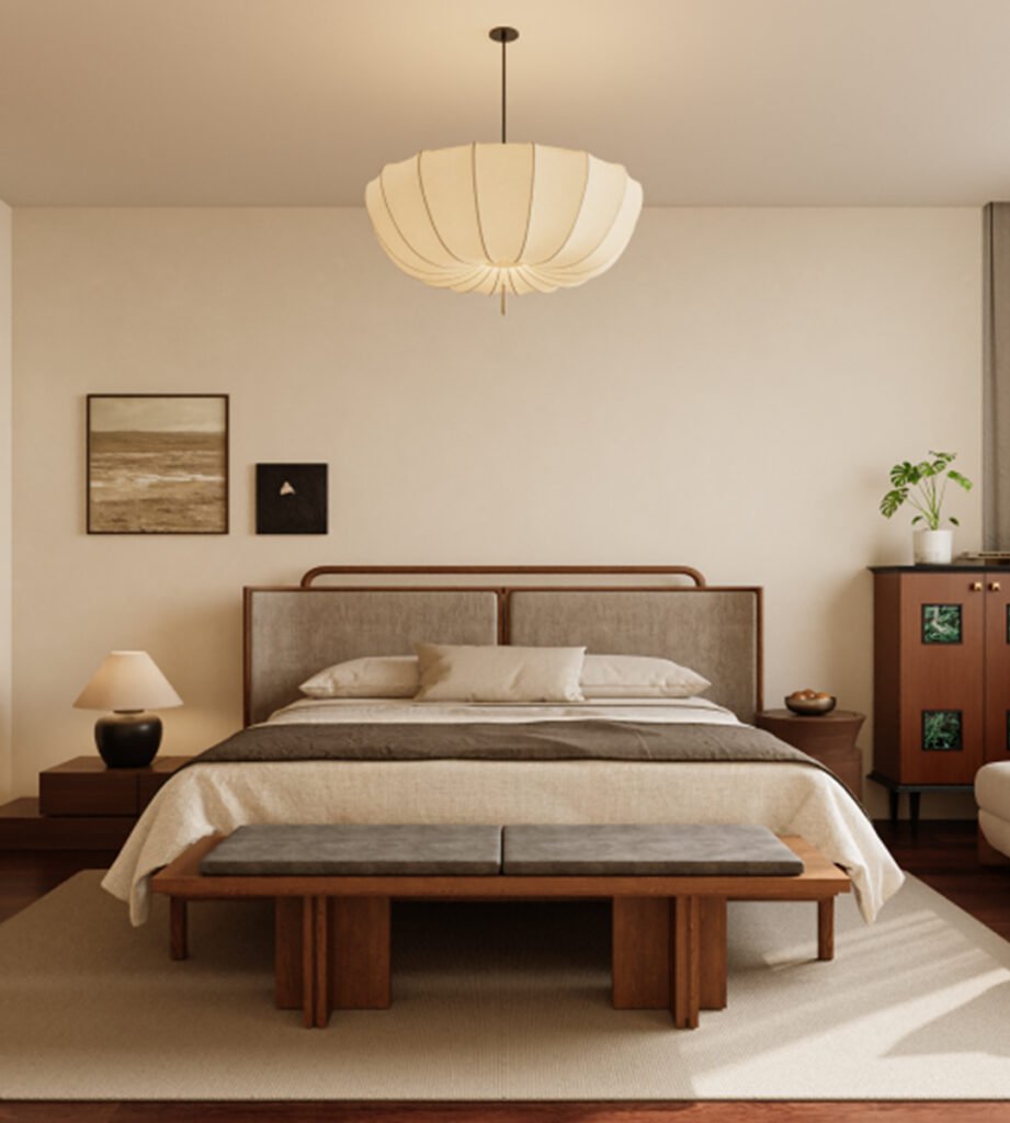Soft beige paint covers most walls, creating a cozy and inviting feel. Paired with reddish-brown flooring, the warm and cool tones play off each other, making the room both warm and bright. The walk-in closet features wooden sliding doors that add depth and dimension while saving space, strengthening the room’s cohesive look. The uniquely shaped beige-gray upholstered bed with a curved headboard stands out alongside brown furniture and green stone slabs, forming a visual focal point. The TV cabinet combines open shelving with closed panels for practicality and variety. The silk pendant light not only illuminates but also, with its soft glow and delicate texture, helps craft a warm and romantic ambiance.