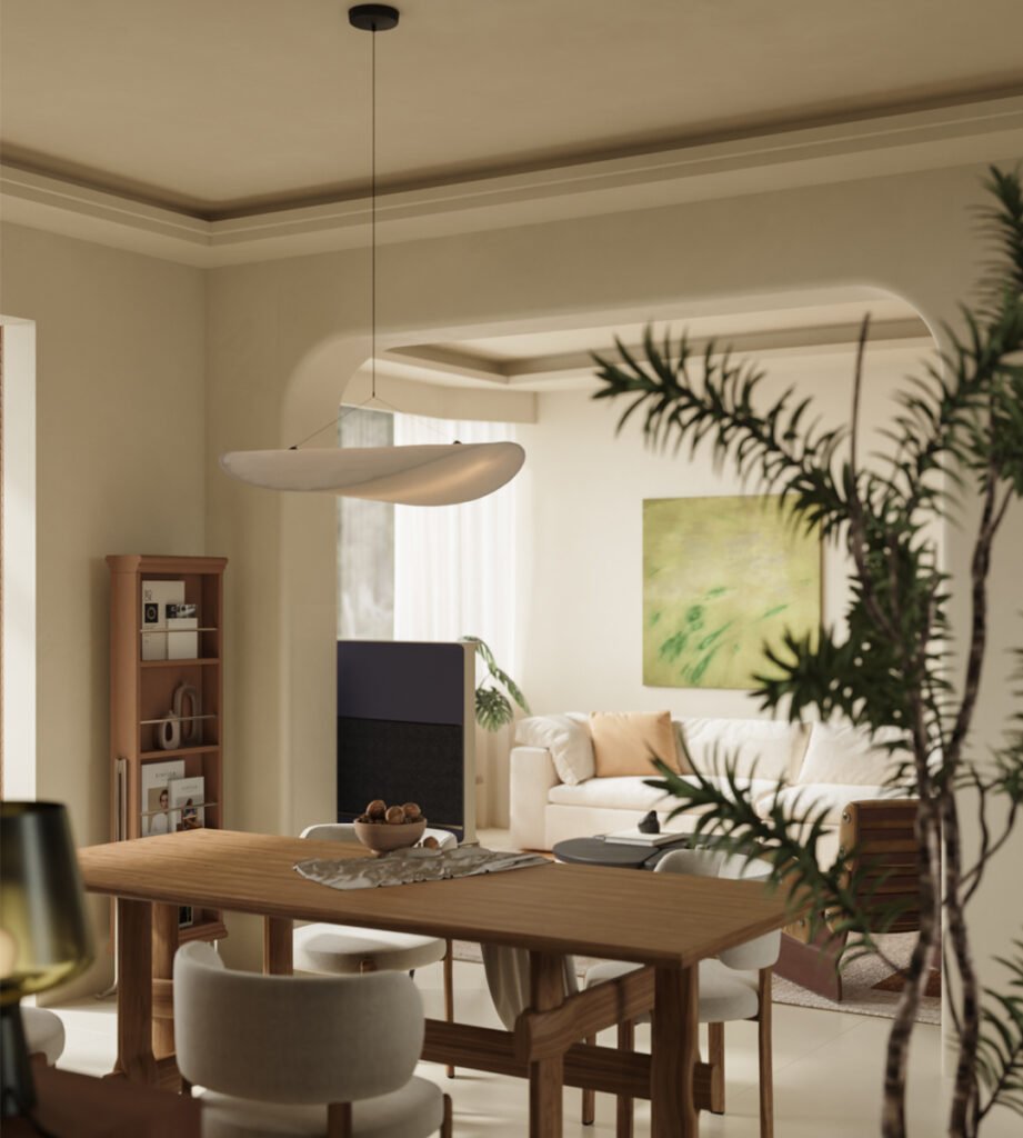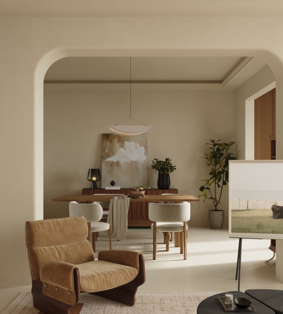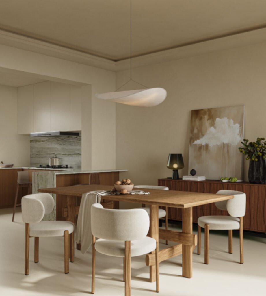 Extensive use of paint and intentional empty space give the room an airy feel. Curved doorways add softness and visual interest, while the hollowed-out cabinet design enhances transparency and flow. The display cabinet can showcase collections and decor while also acting as a subtle room divider—maintaining openness and interaction for a more refined living area layout. The solid wood dining table features crisscrossed legs for beauty and stability, paired with beige upholstered chairs with wooden legs that balance comfort and style. The silk pendant light casts a warm, elegant glow, enriching the dining experience.