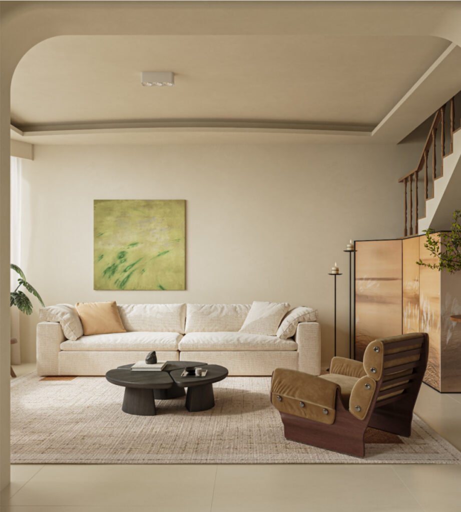 The entrance features a combination of wood and glass, ensuring safety while maximizing natural light to brighten the space. The suspended shoe cabinet is designed with a hollow bottom for easy cleaning, and an open midsection for displaying decorative items, blending practicality with style. On the right, the “800 Storage Unit” with triple-fold wooden doors not only saves space but also adds a unique visual appeal and convenience. The cloud sofa offers both comfort and eye-catching design, while the two-seater bench brings a touch of vintage elegance. The modular walnut coffee table adapts flexibly to different layouts. A rotating bookshelf adds function and fun, complemented by candle-style floor lamps and a silk pendant light—blending diverse elements to create a stylish and artistic atmosphere.